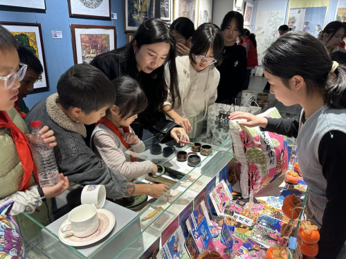 在玻璃展柜前,孩子们围成一圈,盯着柜中憨态可掬的布艺玩偶与创意手作低声讨论:“这个兔子的耳朵是用布料拼的吗?”“我也想做一个这样的小摆件!”学前教育专业志愿者逐一为孩子们讲解作品的创作理念,从色彩搭配到手工技巧,将艺术的种子悄悄播撒在孩子们心里。
