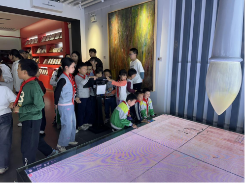 走进艺术教育中心的大门,孩子们瞬间被眼前的场景吸引:展厅中央的互动展陈装置散发着柔和的光,玻璃展柜里的手作展品色彩鲜活,墙上的艺术画作笔触生动。“大家看这个屏幕,用笔在屏幕上写字就会传到大屏幕上哦!”讲解员老师的声音刚落,几个孩子便迫不及待地聚到一起,笔尖轻触屏幕,看着所写的字映在屏幕上,眼睛里满是惊喜。