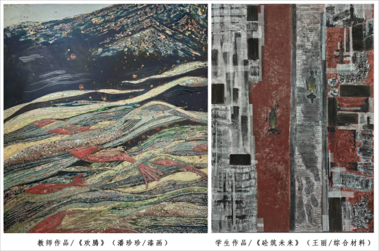 第九届安徽美术大展是安徽省美术界规模最大、规格最高的综合性展览,代表了三年来全省美术创作的最高水平,备受业界与社会关注。艺术与教育学院高度重视此次大展,积极组织师生投身创作,将教学科研与艺术实践紧密结合。经大赛评委会严格评审,学院选送的作品在众多参赛作品中脱颖而出,共计32件作品成功通过复评。其中,《欢腾》(潘珍珍/漆画)、《盛世芳华》(林国霞/漆画)、《禅影》(张成源/漆画)、《淮上·陶居》(许政、余维君/环境设计)、《砼筑未来》(王丽/综合材料)等7件作品获“优秀提名”;另有《山高水长》(何旭峰/漆画)、《山河进行时》(朱文萱/版画)等25件作品成功入选展览。这些作品题材多样,形式丰富,涵盖漆画、油画、版画、综合材料、艺术设计等多个门类,既体现了师生们对传统艺术的深入理解,也展现了他们在当代艺术语言上的创新探索,获得了评委的充分肯定。