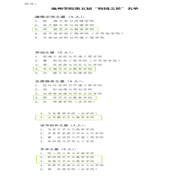 近日,池州学院第五届“校园之星”评选结果正式揭晓,艺术与教育学院8名优秀学子在众多候选人中脱颖而出,荣获“校园之星”荣誉称号。其中23学前教育1班吴艳荣获“道德示范之星”,22音乐学2班朱文瑞荣获“劳动之星”,22音乐学2班程学荣获“志愿服务之星”,22美术学2班左宗鹏荣获“自强奋斗之星”, 23应用心理学荣获马誉齐荣获“读书创作之星”,23音乐学2班郭雨琦、23视觉传达设计2班杨惜玉荣获“艺术之星”。