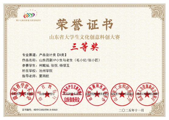 近日,第十七届山东省大学生科技节暨山东省大学生文化创意科创大赛获奖结果揭晓,学院24视觉传达设计3班学生柯毗灿、张悦与23视觉传达设计3班学生杨惜玉的设计作品《山东吕剧IP小生与老生(毛小纪/张小匠)》获三等奖。