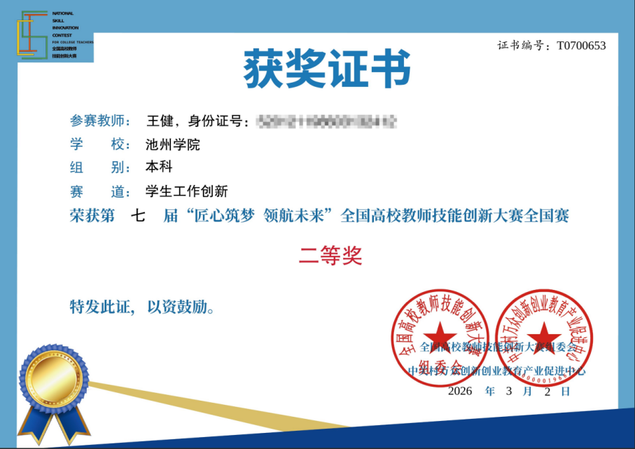大赛内容为教师个人工作创新,分设教学创新、科研创新、学生工作创新、就业创业指导工作创新四个赛道。艺术与教育学院专职辅导员王健老师凭借学生工作创新案例《AI红色音乐育人:AIGC赋能高校思政教育的创新实践》荣获全国二等奖。
