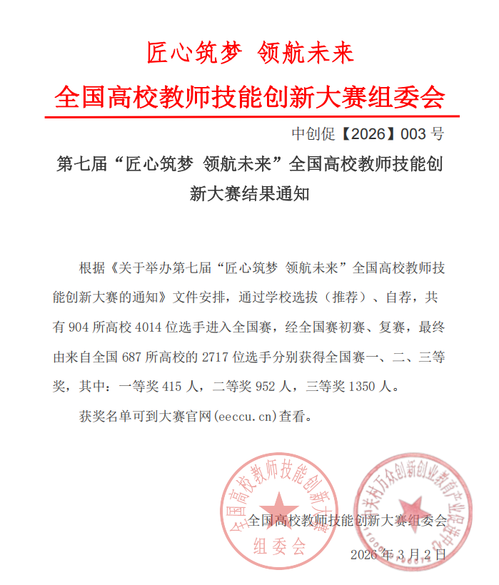 近日,第七届“匠心筑梦 领航未来”全国高校教师技能创新大赛复赛成绩正式发布。本次大赛规模宏大、覆盖面广,全国共有904所高校的4014位选手成功晋级全国赛,经过全国赛初赛、复赛的层层选拔与严格评审,最终来自全国687所高校的2717位选手脱颖而出,分别荣获全国赛一、二、三等奖,其中一等奖415人、二等奖952人、三等奖1350人。
