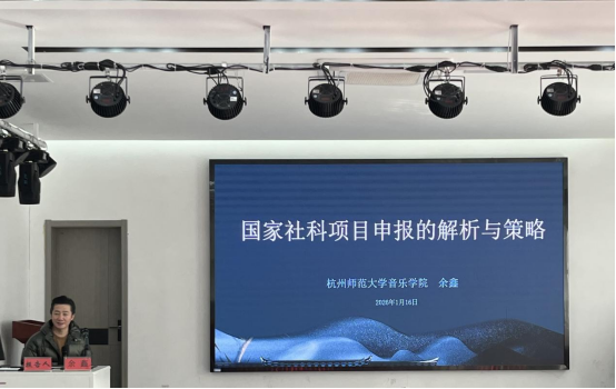 为进一步提升学院教师国家社科基金项目申报能力,推动科研工作高质量发展,1月14日上午,学院在“科研活动周”期间举办专题讲座,特邀杭州师范大学音乐学院余鑫教授作题为《国家社科项目申报的解析与策略》的报告,学院全体教师参加学习,报告会由学院副院长路广宏主持。