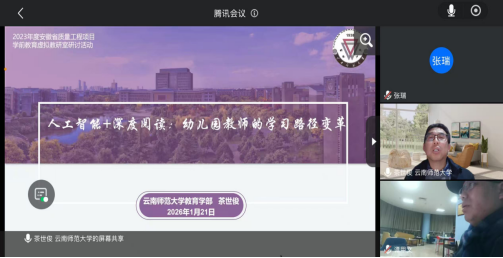 为深化师范专业内涵建设,提升学前教育人才培养质量,省质量工程项目学前教育虚拟教研室(2023xnjys032)于2026年1月21日举办线上学术研讨会议。会议聚焦师范类专业认证的实践反思与教师深度学习路径变革两大主题,特邀淮南师范学院教育学院院长李志勇教授、云南师范大学博士生导师茶世俊教授做主旨分享。省内外多所高校、幼儿园的专家学者及一线教师、学前教育系全体教师60余人参加了本次线上研讨会。